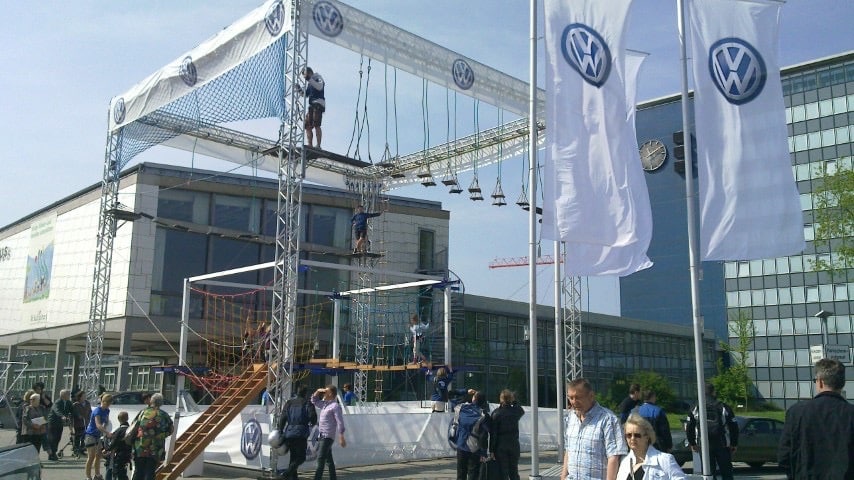 Mieten Sie den spektakulären Seilgarten für Ihre Veranstaltung und bescheren Sie Ihren Gästen einen Adrenalinkick, an den sie sich noch lange nach dem Event erinnern werden. Wir individualisieren den Aufbau des Klettergartens für Sie. So ist es etwa möglich, Werbebanner in das Gerüst zu integrieren.